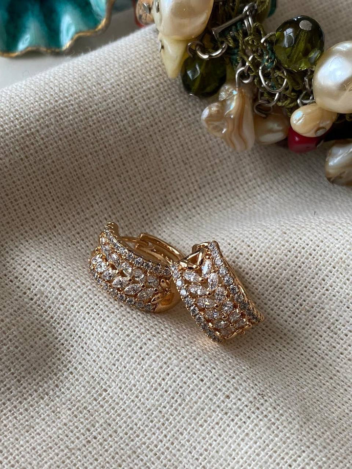 حلق أنيق مطلي بالذهب مزين بأحجار كريستالية شفافة بتصميم متداخل يضفي لمسة فخمة وجذابة، مطلية بالذهب عيار 18 مكفولة سنة لتغير اللون