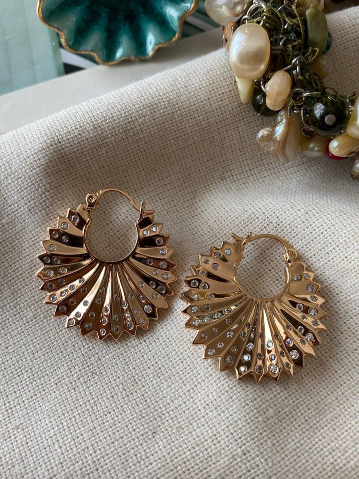 حلق أنيق بتصميم مروحة مطلي بالذهب مزين بحبات ستراس شفافة تضيف لمسة فخمة وجذابة، مطلية بالذهب عيار 18 مكفولة سنة لتغير اللون
