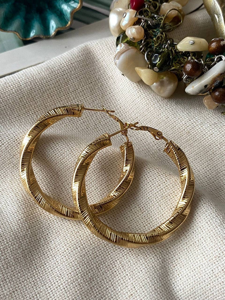 حلق دائري مطلي بالذهب مع نقوش دقيقة تضفي لمسة أنيقة وعصرية تناسب جميع المناسبات.
