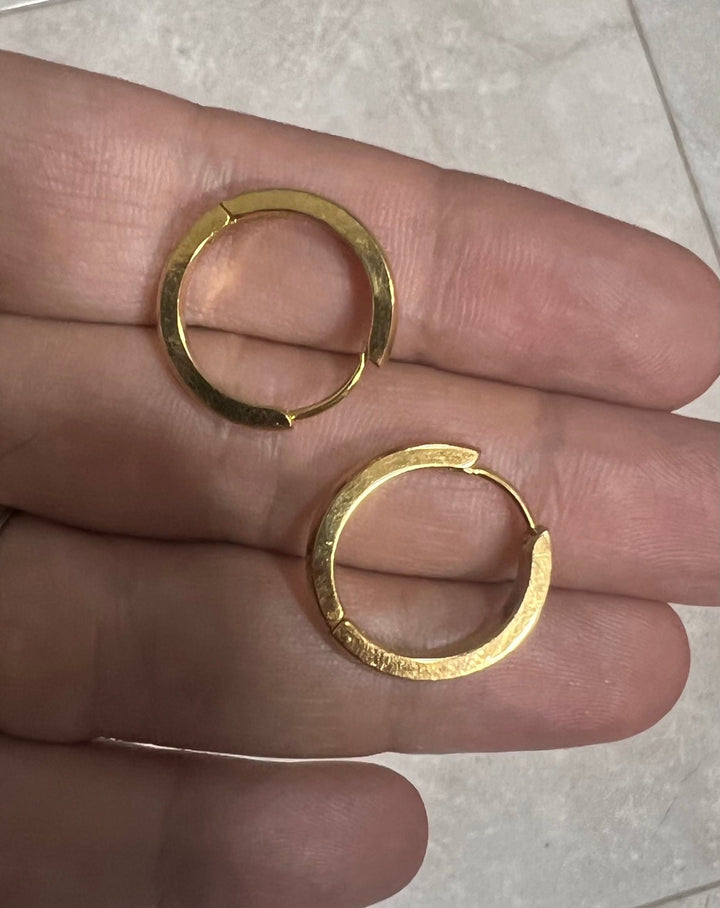 حلق دائري صغير بتصميم ناعم وأسطح لامعة تعكس البساطة والأناقة. مصنوع من المعدن المطلي باللون الذهبي ليمنحك لمسة كلاسيكية مشرقة تناسب كل الأوقات. حلق متين وخفيف الوزن، مثالي للاستخدام اليومي والمناسبات الخاصة. مطلي بالذهب عيار 18 مكفول سنة لتغير اللون.