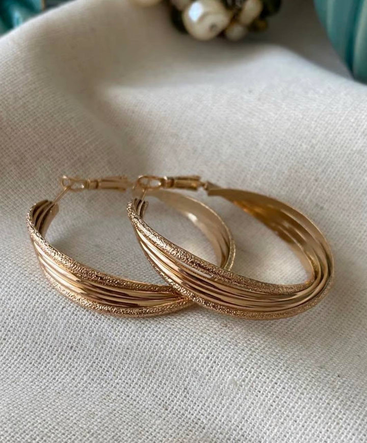 حلق دائري صغير الحجم بتصميم متعدد الطبقات يعطي بُعداً أنيقاً وملمساً متنوعاً. يتميز اللون الذهبي الدافئ المائل للبرونزي مع تشطيب مزيج من الأسطح الملساء والخشنة التي تضفي لمسة فريدة وعصرية. مناسب للإطلالات اليومية والكاجوال، مطلي بالذهب عيار 18 مكفول سنة لتغير اللون.