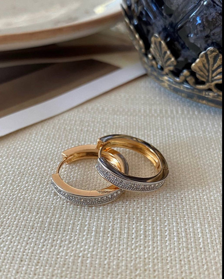 حلق دائري ذهبي مزين بحبات صغيرة لامعة تضيف لمسة أنيقة وفاخرة للمظهر.