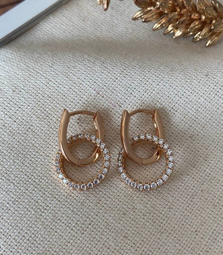 حلق أنيق مطلي بالذهب الوردي مع دائرة مرصعة بأحجار ستراس براقة تضيف لمسة فخمة وعصرية.