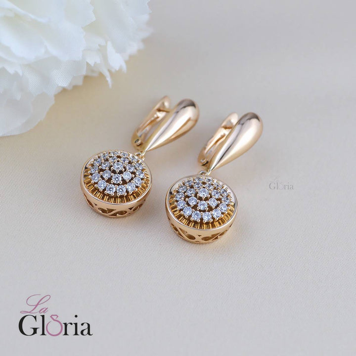 حلق ذهبي دائري مزين بأحجار كريستالية شفافة متلألئة، تصميم أنيق يضفي لمسة فخمة ورقي على المظهر.