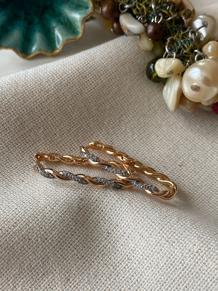 حلق دائري مصمم بتداخل ملتف بين خطوط ذهبية وفضية لامعة تضفي لمسة عصرية وأنيقة على الإطلالة. الحلق متوسط الحجم ومزود بتشطيب ناعم يبرز تألقه مع طبقات من اللمعان الفضية التي تتماشى مع الذهب الوردي. مطلي بالذهب عيار 18 مكفول سنة لتغير اللون.