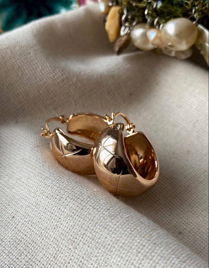 حلق أنيق بتصميم هلالي عريض مطلي بالذهب اللامع مع تفاصيل ناعمة تضيف لمسة فخمة وعصرية للمظهر، مطلية بالذهب عيار 18 مكفولة سنة لتغير اللون