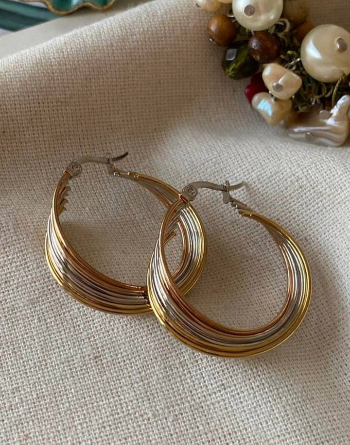 حلق أنيق بتصميم هلالي مميز مصنوع من معادن متعددة الألوان تجمع بين الذهبي والفضي، يضفي لمسة عصرية وفاخرة على الإطلالة، مطلية بالذهب عيار 18 مكفولة سنة لتغير اللون