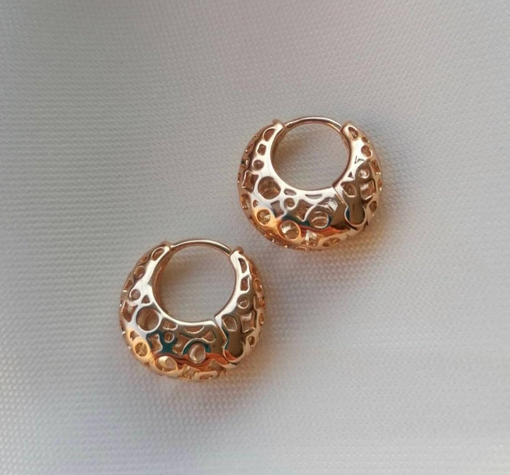 حلق هلالي ذهبي اللون بتصميم منقوش بأشكال هندسية بارزة، يضفي لمسة عصرية وأنيقة للمظهر، مطلية بالذهب عيار 18 مكفولة سنة لتغير اللون