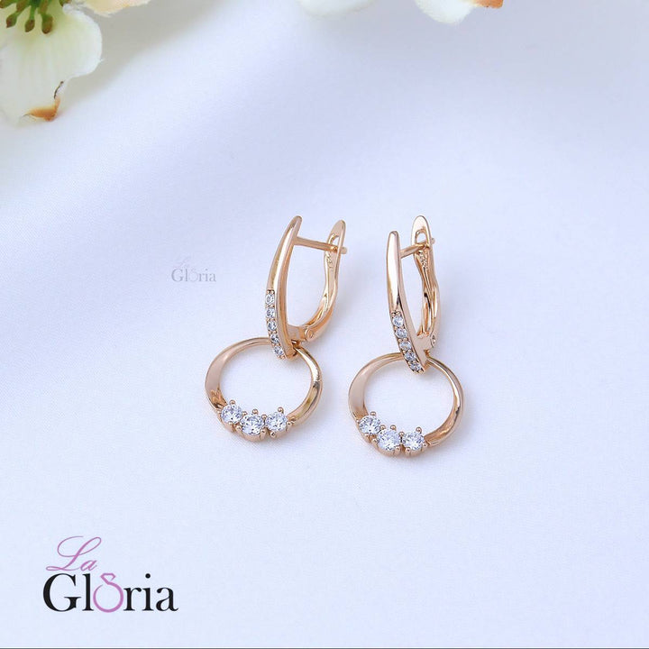 حلق أنيق مطلي بالذهب الوردي مع دوائر مزينة بثلاثة أحجار كريستال لامعة وتفاصيل صغيرة من الأحجار على الساق تضيف لمسة فخمة وعصرية، مطلية بالذهب عيار 18 مكفولة سنة لتغير اللون