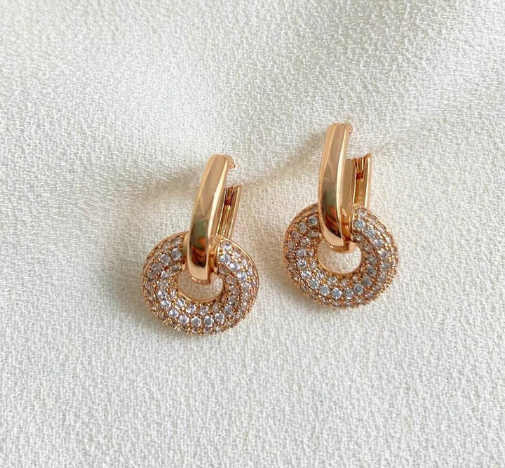حلق أنيق مطلي بالذهب الوردي مع دوائر مرصعة بأحجار براقة تضيف لمسة فخمة وعصرية للمظهر.