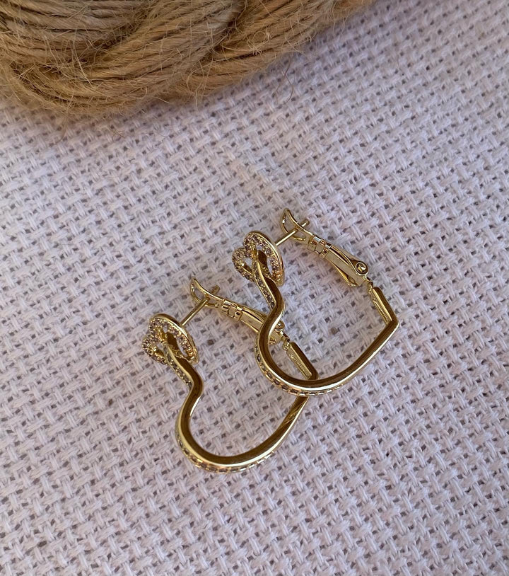 حلق صغير أنيق بلون ذهبي يبرز من تصميمه المتعرج الذي يضفي لمسة عصرية فريدة. مزين بحبات صغيرة من الأحجار اللامعة على الجزء العلوي للثبات والتألق. يتميز بقفل مريح يضمن ثباته عند الارتداء. مطلي بالذهب عيار 18 مكفول سنة لتغير اللون.