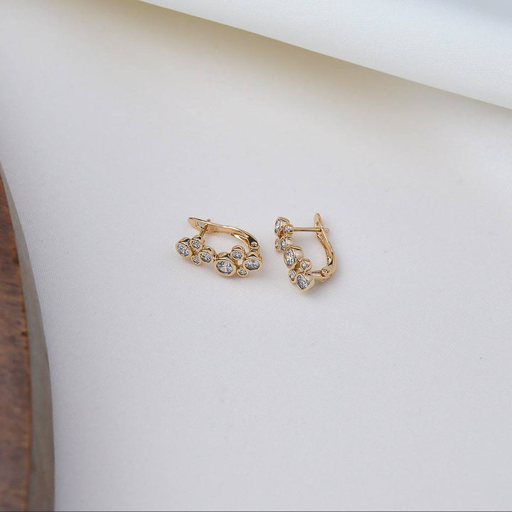 حلق أنيق مطلي بالذهب مزين بأحجار كريستال شفافة بأحجام مختلفة، يضفي لمسة فاخرة وعصرية على المظهر.