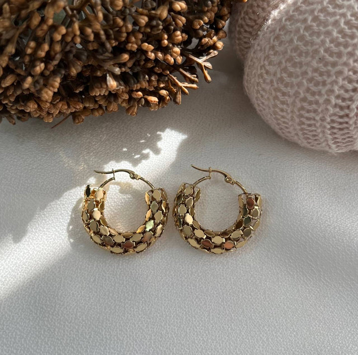 حلق دائري ذهبي بتصميم منقوش يعكس الأضواء بشكل أنيق، مصنوع من معدن مطلي بالذهب لإطلالة فاخرة وعصرية.