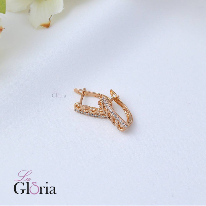 حلق أنيق مطلي بالذهب الوردي مع تصميم متشابك مزين بحبات صغيرة من الستراس تضيف لمسة فخمة وعصرية، مطلية بالذهب عيار 18 مكفولة سنة لتغير اللون