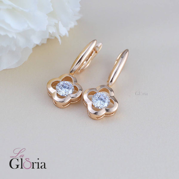 حلق أنيق مطلي بالذهب الوردي مع تصميم زهري مركزي مزين بحجر ستراس لامع يضفي لمسة فخمة وأنثوية.