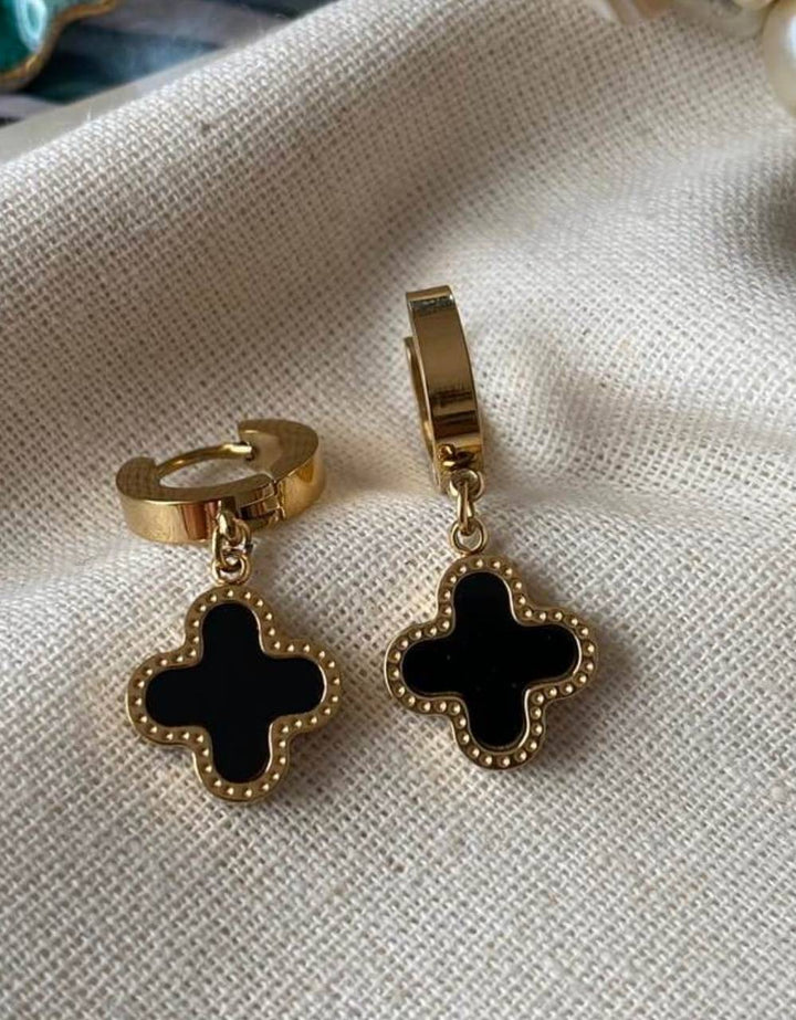 حلق أنيق مطلي بالذهب مع قطعة صليب سوداء محاطة بتفاصيل نقطية تضيف لمسة فخمة وعصرية، مطلية بالذهب عيار 18 مكفولة سنة لتغير اللون