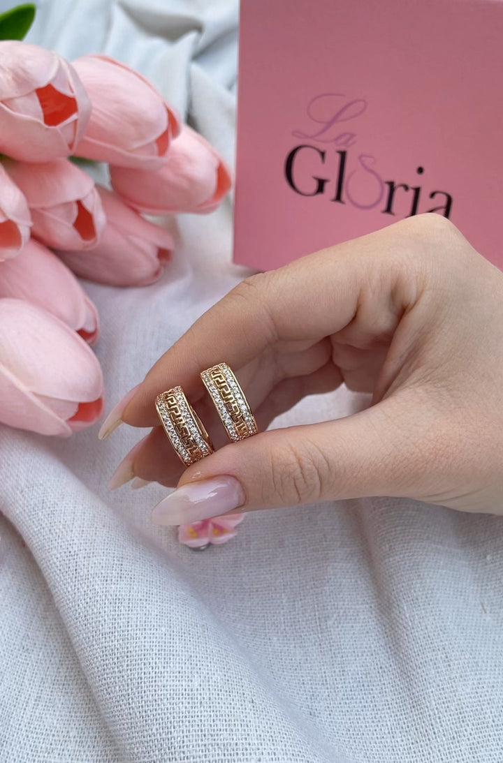 حلق صغير أنيق بتصميم نصف دائري مزين بنقشة يونانية وسط صفين من الأحجار الشفافة اللامعة التي تضفي بريقاً فاخراً على مظهرك. يأتي باللون الذهبي الدافئ ليمنح إطلالتك لمسة كلاسيكية متجددة. مطلي بالذهب عيار 18 مكفول سنة لتغير اللون، مطلية بالذهب عيار 18 مكفولة سنة لتغير اللون
