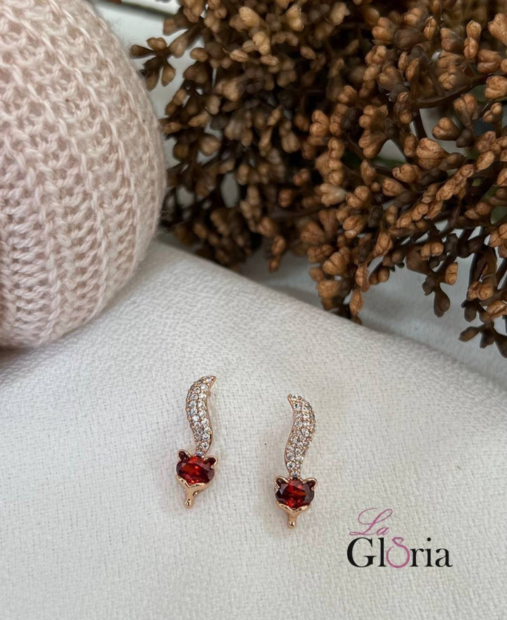 حلق أنيق مطلي بالذهب الوردي مزين بحجر أحمر على شكل رأس قط مع تفاصيل من الستراس الأبيض تضيف لمسة فخمة وعصرية، مطلية بالذهب عيار 18 مكفولة سنة لتغير اللون