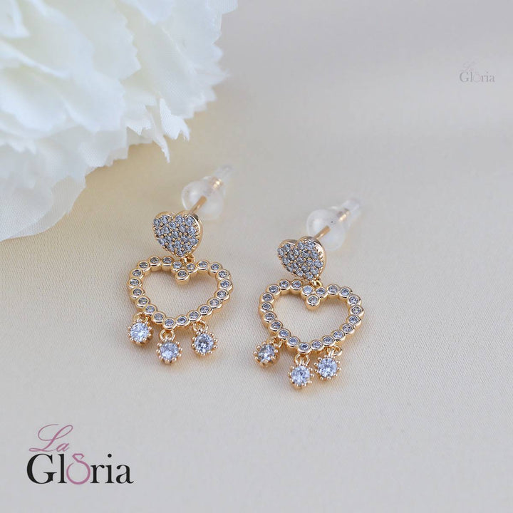 حلق ذهبي مزين بأحجار ستراس شفافة على شكل قلب مع ثلاث حبات متدلية تضيف لمسة أنيقة وجذابة.