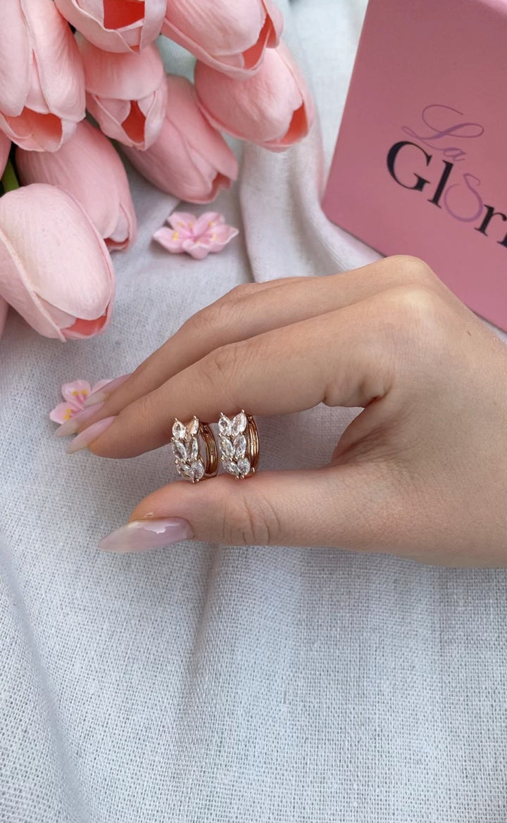 حلق صغير ذهبي أنيق مزين بأحجار شفافة على شكل أوراق متراصة بروح طبيعية تضفي لمسة ناعمة وأنثوية. تصميم دائري يخطف الأنظار ويبرز بريق الأحجار المتلألئة. مطلي بالذهب عيار 18 مكفول سنة لتغير اللون، مطلية بالذهب عيار 18 مكفولة سنة لتغير اللون