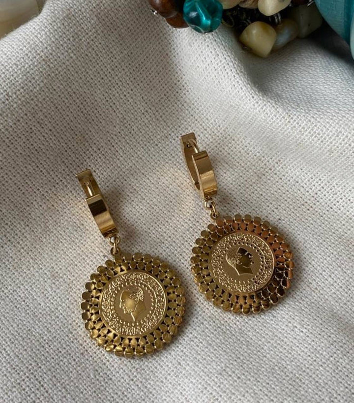 حلق أنيق مطلي بالذهب بتصميم عملة دائرية مزخرفة مع تفاصيل دقيقة تضيف لمسة كلاسيكية وفخمة للمظهر، مطلية بالذهب عيار 18 مكفولة سنة لتغير اللون