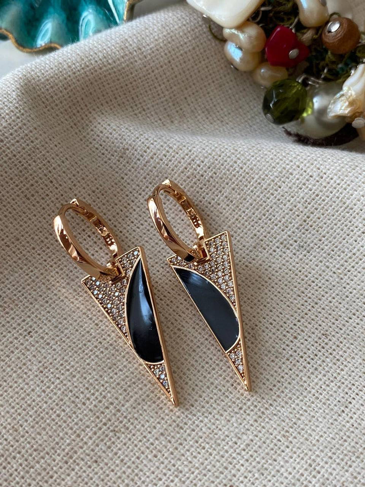 حلق أنيق بتصميم مثلثي مطلي بالذهب مع تفاصيل من الأحجار اللامعة وحجر أسود في المنتصف يضفي لمسة عصرية وفخمة.