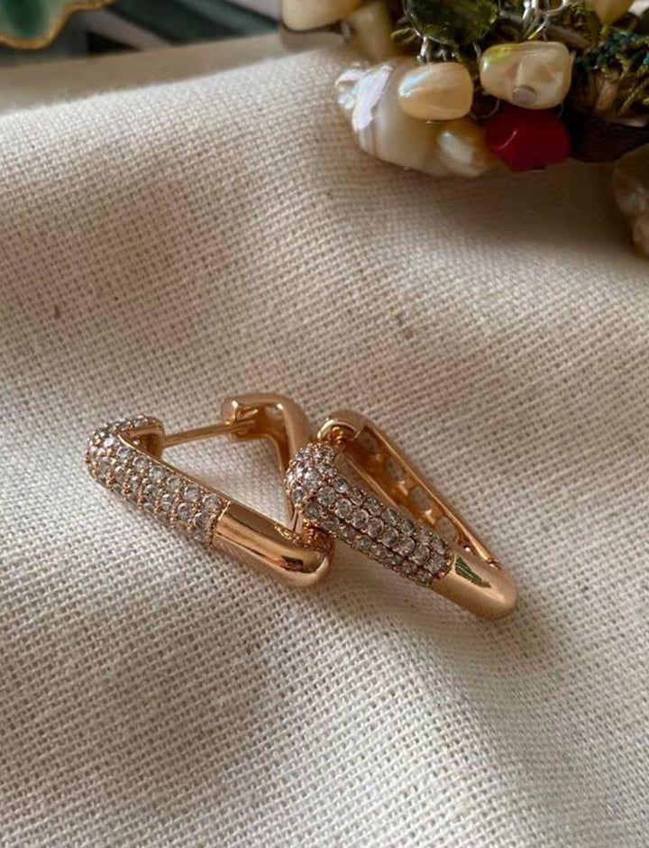 حلق ذهبي بشكل مثلث مزين بأحجار لامعة تضيف لمسة أنيقة وفاخرة للمظهر.