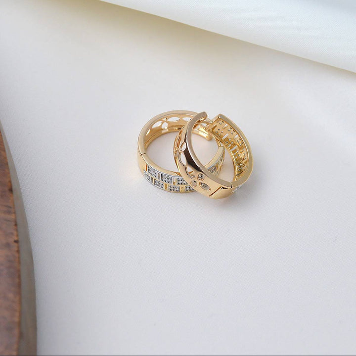 حلق ذهبي بتصميم دائري مزخرف بفتحات ونقوش هندسية مع لمسات من الأحجار اللامعة تضفي مظهراً أنيقاً وفاخراً، مطلية بالذهب عيار 18 مكفولة سنة لتغير اللون