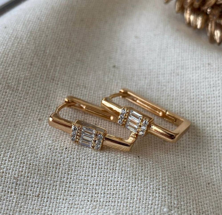 حلق أنيق مطلي بالذهب بتصميم مستطيل مزين بأحجار شفافة تضيف لمسة فخمة وعصرية للمظهر، مطلية بالذهب عيار 18 مكفولة سنة لتغير اللون