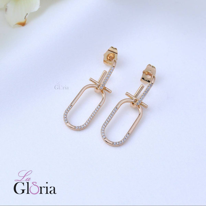 حلق أنيق مطلي بالذهب بتصميم مستطيل مزين بأحجار ستراس لامعة تضيف لمسة فخمة وعصرية، مطلية بالذهب عيار 18 مكفولة سنة لتغير اللون
