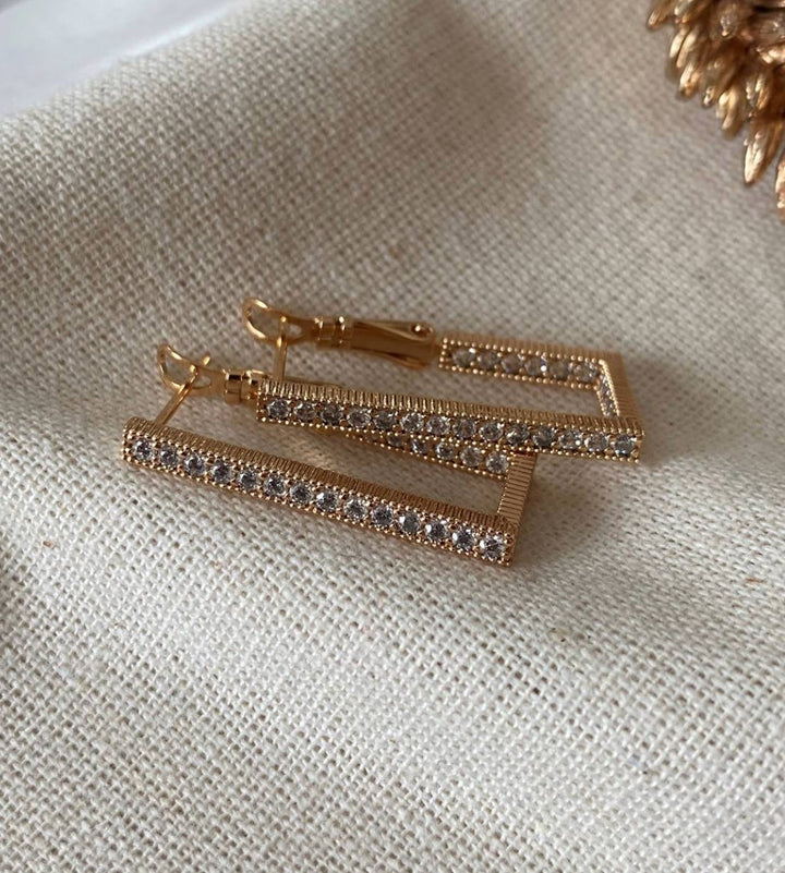 حلق ذهبي مستطيل الشكل مزين بحبات لامعة من الستراس، تصميم أنيق يضفي لمسة فاخرة وعصرية.