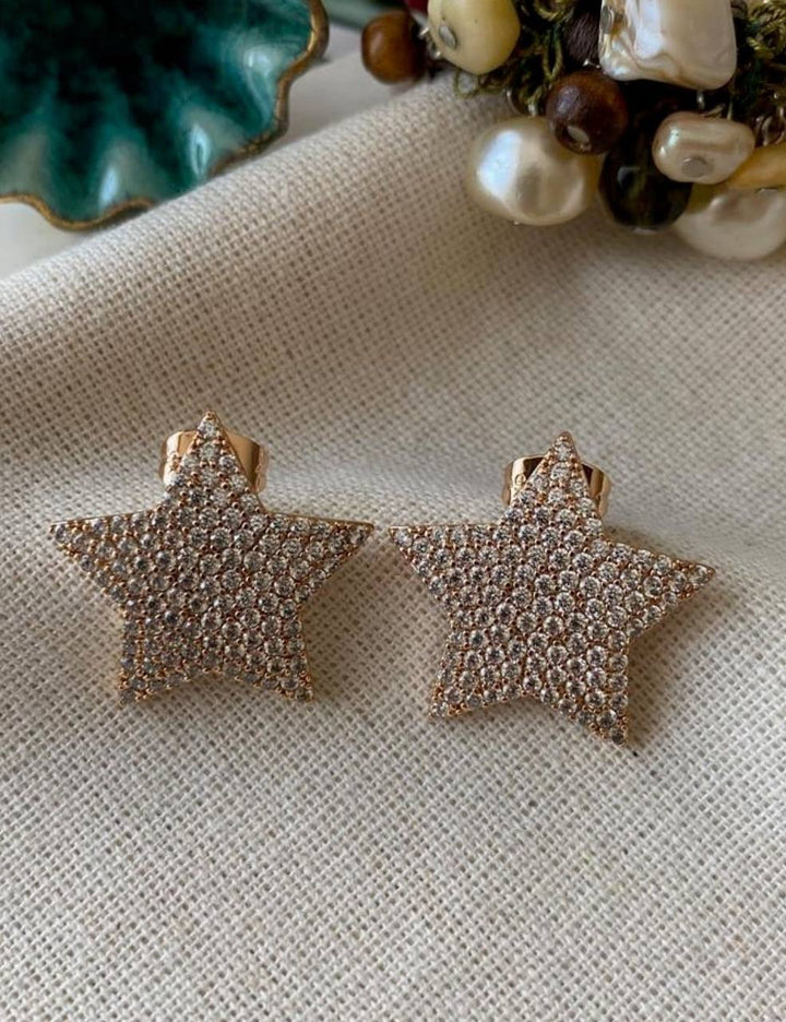 حلق على شكل نجمة مطلي بالذهب ومزين بأحجار ستراس براقة تضيف لمسة أنيقة وجذابة للمظهر، مطلية بالذهب عيار 18 مكفولة سنة لتغير اللون