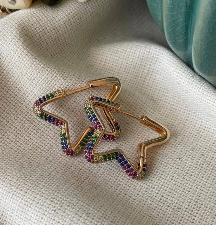 حلق على شكل نجمة مطلي بالذهب مزين بأحجار ملونة تضيف لمسة حيوية وأنيقة للمظهر.
