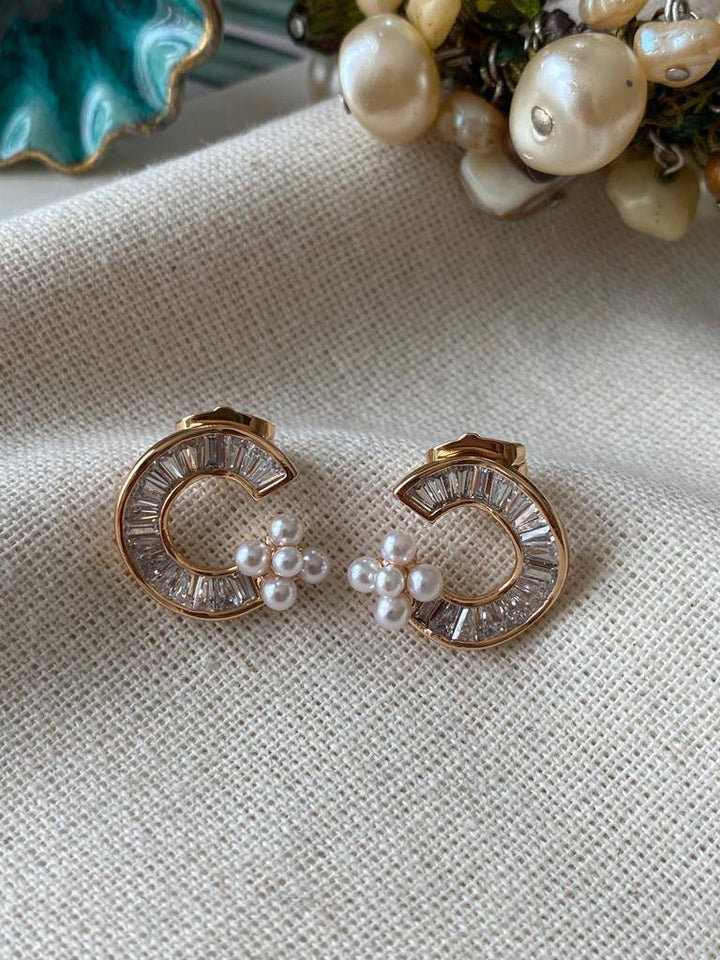 حلق أنيق بتصميم نصف دائرة مطلي بالذهب مع أحجار شفافة وتفاصيل لؤلؤية تضيف لمسة فخمة ورقيقة.