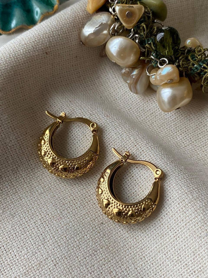 حلق صغير نصف دائري ذهبي اللون مزين بنقوش بارزة وقطع صغيرة متداخلة تضفي عليه لمسة فنية مميزة. تصميم متين وأنيق يناسب الإطلالات اليومية والرسمية على حد سواء. مطلي بالذهب عيار 18 مكفول سنة لتغير اللون.