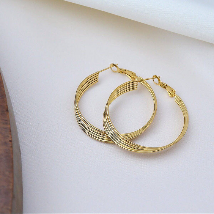 حلق أنيق بتصميم هلالي متعدد الخطوط باللون الذهبي اللامع، يضفي لمسة كلاسيكية وعصرية في آن واحد.
