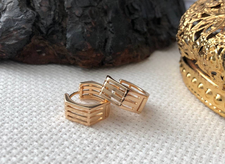 حلق أنيق مطلي بالذهب بتصميم مستطيل مفتوح مع خطوط متوازية تضيف لمسة عصرية وفخمة للمظهر، مطلية بالذهب عيار 18 مكفولة سنة لتغير اللون