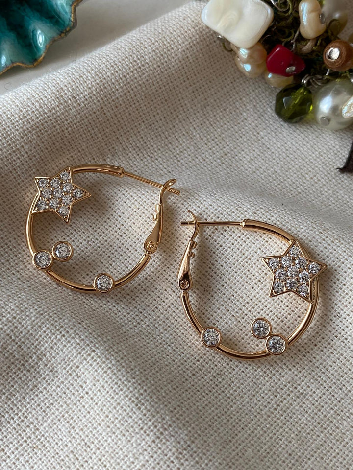حلق دائري ذهبي يضفي لمسة أنيقة على إطلالتك، مزين بنجمة صغيرة متلألئة مرصعة بأحجار كريستال شفافة تتوزع بشكل متناغم، إلى جانب ثلاث أحجار كريستال دائرية ملتفة بأسلوب ذكي على السوار الذهبي. تصميم متدلي يناسب الاستخدام اليومي والمناسبات الخاصة. مطلي بالذهب عيار 18 مكفول سنة لتغير اللون.