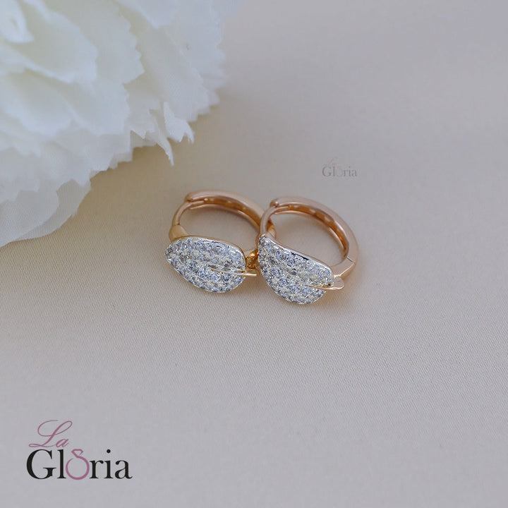 حلق صغير دائري ذهبي مزين بواجهات على شكل أوراق مرصعة بأحجار كريستالية شفافة تضفي لمسة براقة وأنيقة. تصميم متين وعصري يناسب الإطلالات اليومية والرسمية. مطلي بالذهب عيار 18 مكفول سنة لتغير اللون، مطلية بالذهب عيار 18 مكفولة سنة لتغير اللون