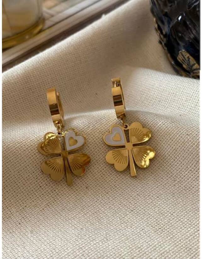 حلق ذهبي بتصميم ورقة رباعية القلوب مع لمسات بيضاء صغيرة، يضفي مظهراً أنيقاً وعصرياً، مطلية بالذهب عيار 18 مكفولة سنة لتغير اللون