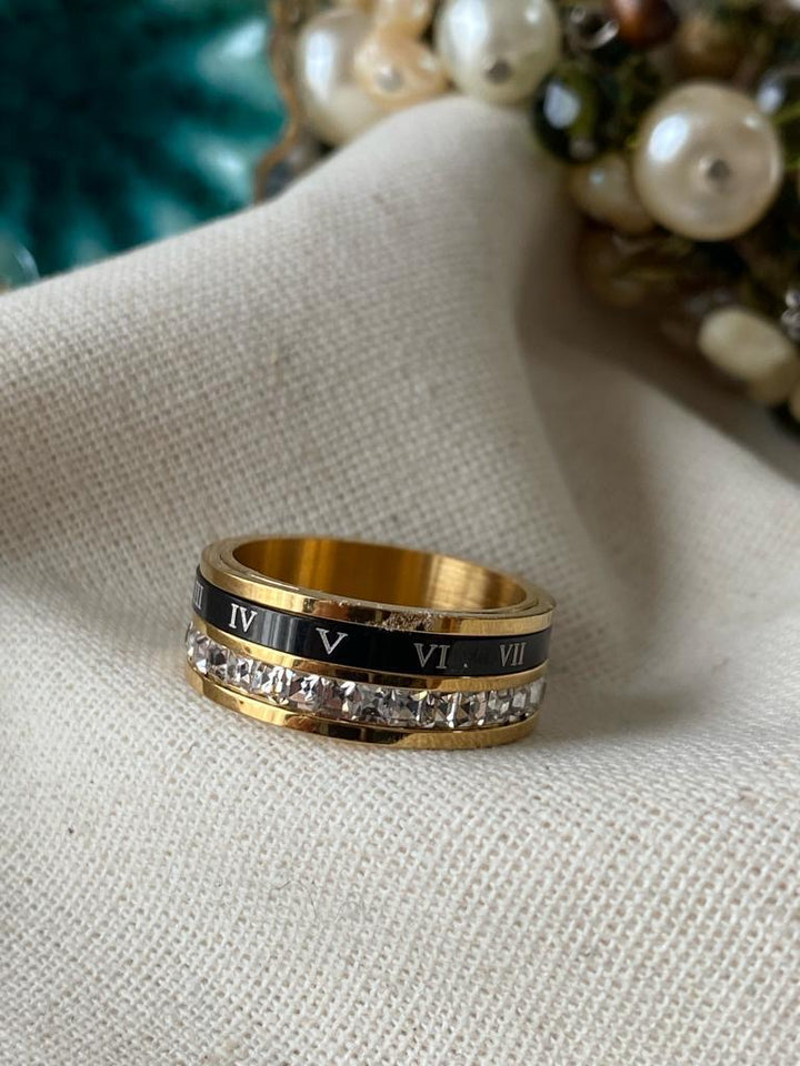 خاتم بتصميم عريض مكون من قطعتين متلاصقتين، حيث تأتي القطعة العلوية مزينة بنقوش الأرقام الرومانية باللون الأسود، بينما القطعة السفلية تتوسطها صف من الفصوص الصغيرة البراقة التي تضيف لمسة من الفخامة واللمعان. يتميز الخاتم باللون الذهبي المعدني الذي يمنحه أناقة مميزة وعصرية. مطلي بالذهب عيار 18 مكفول سنة لتغير اللون.