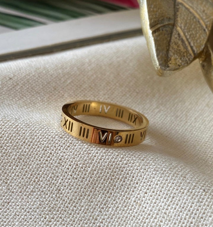 خاتم ذهبي أنيق بتصميم رفيع يعرض أرقام رومانية محفورة على كامل محيط الخاتم، مع لمسة فريدة عند الرقم السادس حيث تم تمييزه بلوحة معدنية باللون الوردي تبرز رقماً فضياً وقطعة فص بسيط تزين الجهة المقابلة، ما يضفي توازنًا رائعًا بين الكلاسيكية والعصرية. مطلي بالذهب عيار 18 مكفول سنة لتغير اللون.