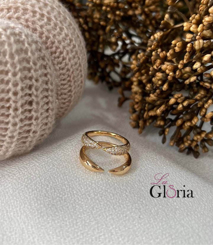 خاتم بتصميم أنيق مكون من قطعتين متقابلتين، حيث تأتي إحدى القطعتين بتفاصيل مزينة بفصوص صغيرة براقة تضفي لمسة من الفخامة واللمعان، بينما القطعة الأخرى تتميز بسلاسة ولمسة موزعة بطريقة تبرز جمال التصميم بشكل موازن. يأتي الخاتم بلون روز جولد دافئ يعكس الأناقة والأنوثة، بتصميم رفيع يناسب الإطلالة اليومية والمناسبات الخاصة على حد سواء. مطلي بالذهب عيار 18 مكفول سنة لتغير اللون.