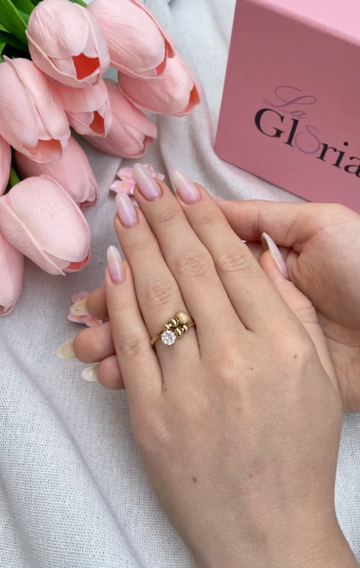 خاتم ذهبي بتصميم مميز يتكون من قطعتين متقابلتين، حيث تأتي إحدى القطعتين مزينة بحجر ألماس دائري لامع يبرز وسط الخاتم، بينما تتميز القطعة الأخرى بحبة ذهبية مجعدة تحاكي شكل الكرة ومجموعة من الكريات الصغيرة المصفوفة بجانبها. الخاتم يتميز بخط رفيع يضفي عليه لمسة أنيقة وعصرية. مطلي بالذهب عيار 18 مكفول سنة لتغير اللون.