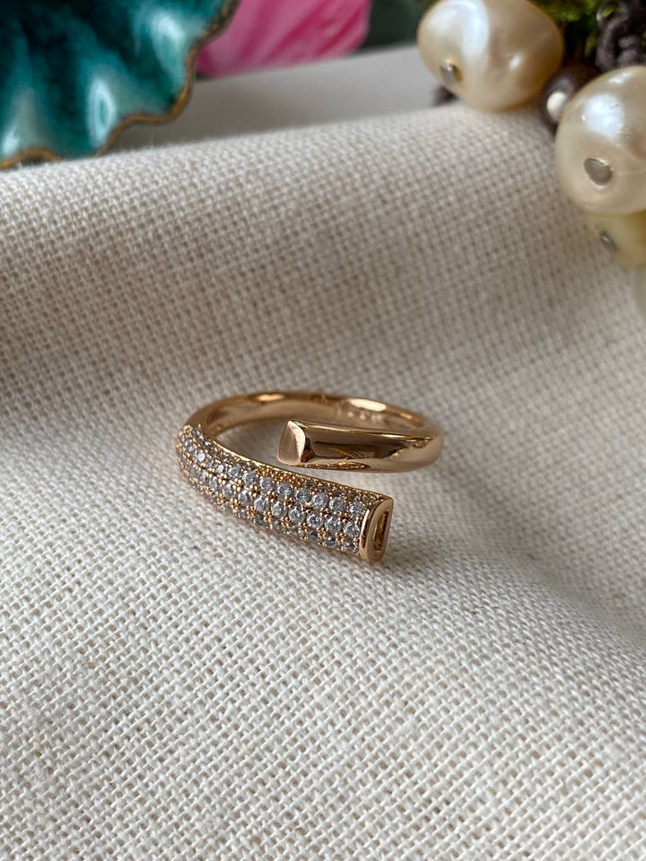 خاتم رفيع بتصميم مفتوح ينحني بأسلوب أنيق يبرز لمسة عصرية مميزة، مصنوع بلون روز جولد دافئ يضفي دفء وأناقة على الإصبع. الجانب المزخرف مليء بفصوص صغيرة متلألئة تغطي السطح بشكل متقن لتعكس الضوء ببراعة، مقابل جانب مصقول لامع يضفي توازنًا رائعًا بين البساطة والزخرفة. مطلي بالذهب عيار 18 مكفول سنة لتغير اللون.