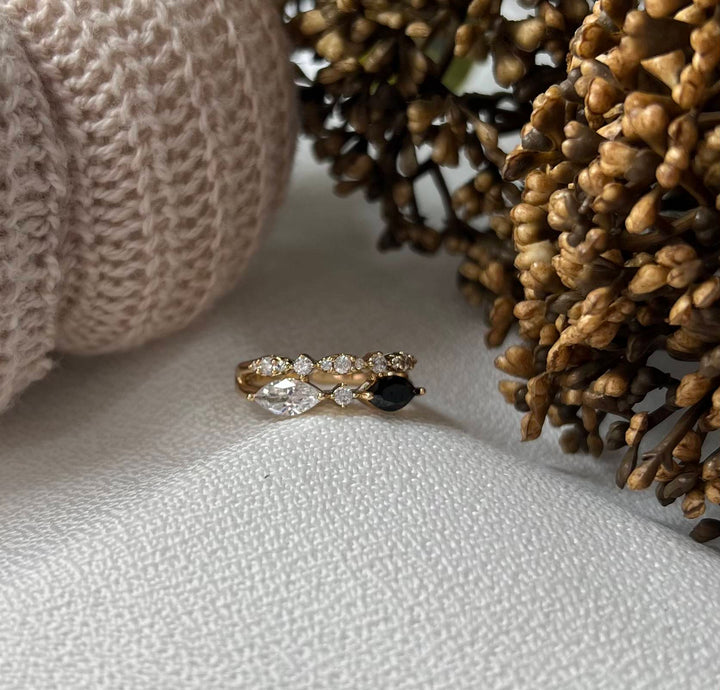 خاتم أنيق مكون من قطعتين متلاصقتين تعكس تميزاً في التصميم، باللون الذهبي الناعم. قطعة علوية مزينة بسلسلة من الفصوص البيضاء اللامعة الصغيرة التي تضفي لمسة من الفخامة والرقة، بينما القطعة السفلية تحمل حجرين بارزين، أحدهما أبيض بشكل ماركيز والآخر أسود كأنه قطرات من الأناقة معززة بفصين دائريين صغيرين بينهما. الخاتم بتصميم رفيع يبرز الأنوثة ويمنح لمسة كلاسيكية عصرية في آن واحد. مطلي بالذهب عيار 18 مكفول سنة لتغير اللون.