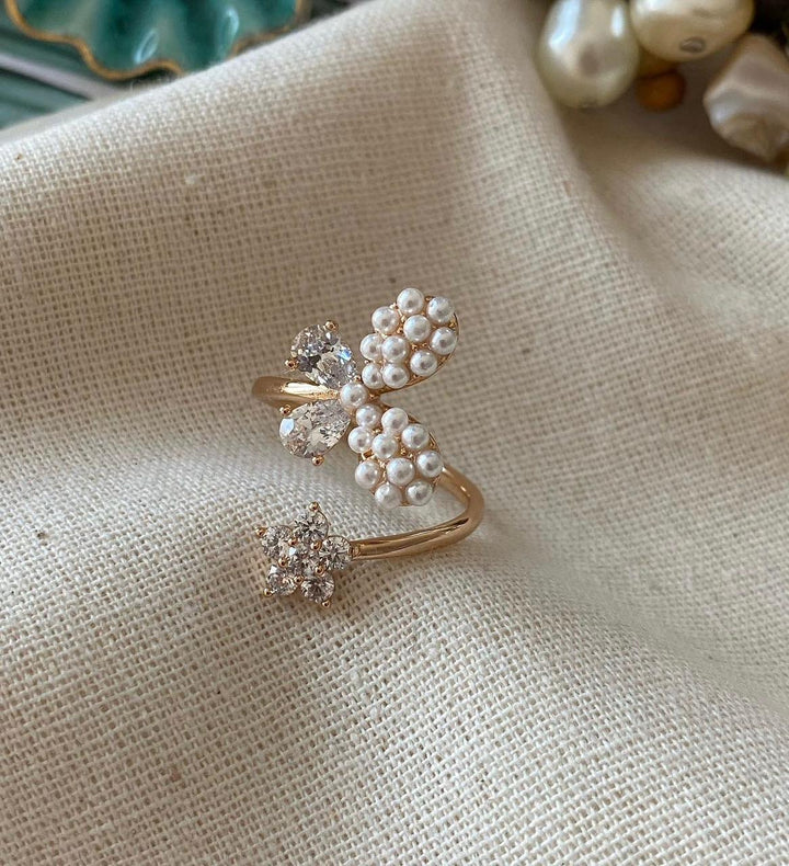 خاتم رفيع بتصميم مفتوح يجمع بين شكل الفراشة الناعم والزهرة الصغيرة المتلألئة، مزين بحبات لؤلؤ بيضاء دقيقة وأحجار كريستالية شفافة تضفي بريقاً أنيقاً على التصميم. يأتي باللون الذهبي الناعم ليبرز تفاصيل الزينة بشكل جمالي أنيق. مطلي بالذهب عيار 18 مكفول سنة لتغير اللون.