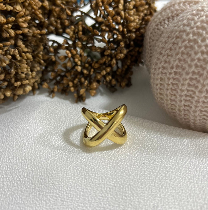 خاتم بتصميم جذاب يتألف من قطعتين متقابلتين تتقاطعان بشكل أنيق، مما يمنح الخاتم طابعاً عصرياً وبسيطاً في آن واحد. يأتي الخاتم بلون ذهبي لامع يعكس الفخامة والرقي، مع سطح أملس ومعالجة دقيقة تبرز تفاصيل التقاطع بشكل واضح. التصميم عريض نسبياً ليمنح اليد لمسة مميزة وجذابة. مطلي بالذهب عيار 18 مكفول سنة لتغير اللون.