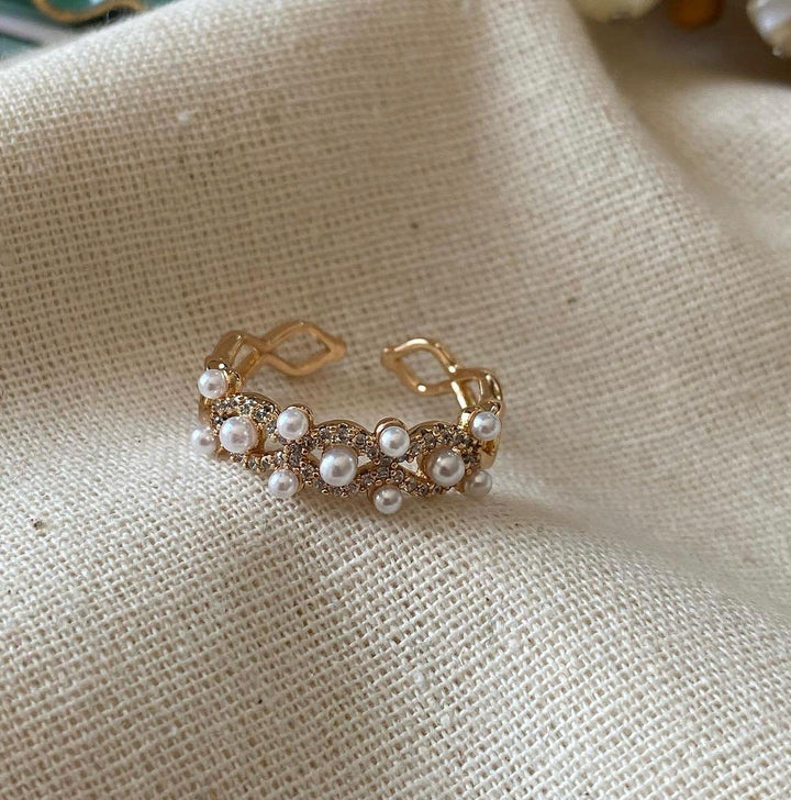 خاتم أنيق بتصميم مفتوح يجمع بين التداخلات المنحنية والدوائر المتناسقة، مزين بحبات لؤلؤ بيضاء صغيرة ومتوسطة الحجم موزعة بشكل متناغم على كامل سطح الخاتم مع فصوص براقة تضيف لمسة من الفخامة والأنوثة. يتميز بلونه الذهبي الدافئ الذي يعزز جمال التفاصيل ويمنحه إطلالة مفعمة بالرقي. تصميمه الرقيق يجعله مثالياً للتنسيق مع إطلالاتك اليومية والكلاسيكية على حد سواء. مطلي بالذهب عيار 18 مكفول سنة لتغير اللون.