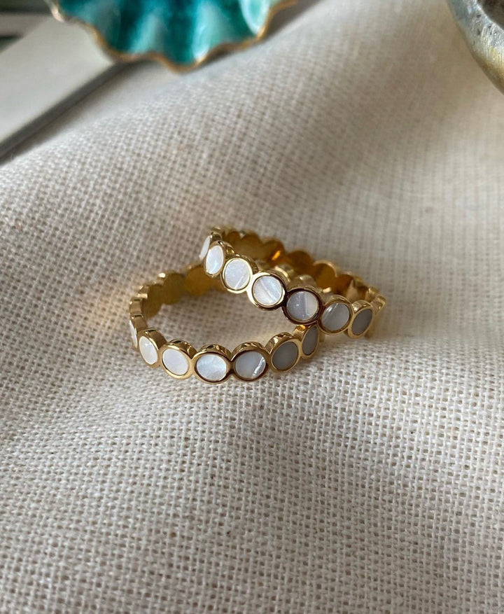 خاتم أنيق بعرض متوسط يتكون من دوائر متجاورة بتصميم متصل، يبرز جمال اللؤلؤ الأبيض المتداخل داخل كل دائرة بشكل متناغم. الخاتم يأتي بلون ذهبي ناعم يعكس الفخامة والرقي، مع لمسة عصرية تناسب مختلف الإطلالات. التصميم المفتوح يعطي شعورًا بالخفة والرشاقة، مما يجعله خيارًا مثاليًا للارتداء اليومي أو المناسبات الخاصة. مطلي بالذهب عيار 18 مكفول سنة لتغير اللون.